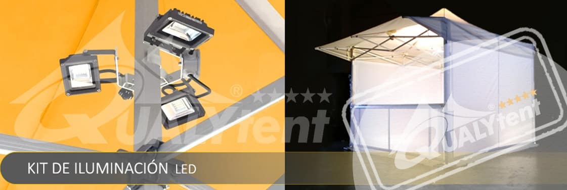 Uno de nuestros accesorios de carpas Qualytent, el Kit de iluminación compuesto por tres focos LED de 10W. Fijada de forma manual y sencilla sobre el mástil central de las carpas. Los datos técnicos en nuestra ficha de producto.