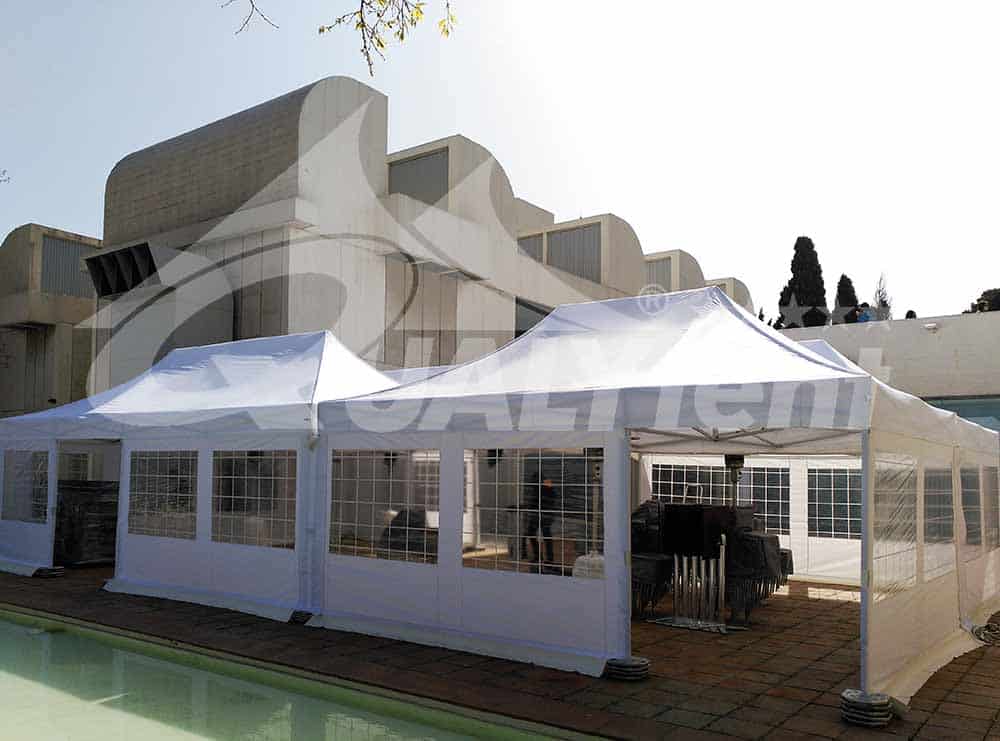 Esta carpa modular de 8x12m se consigue con la unión de cuatro carpas Premium de 4x6m, unidas entre si mediante abrazaderas de unión y pesos. Además de los varios accesorios de nuestro catálogo, como los tapajuntas o las paredes, en este caso con ventana de pvc, que permite la entrada de luz y no perderse buenas vistas.