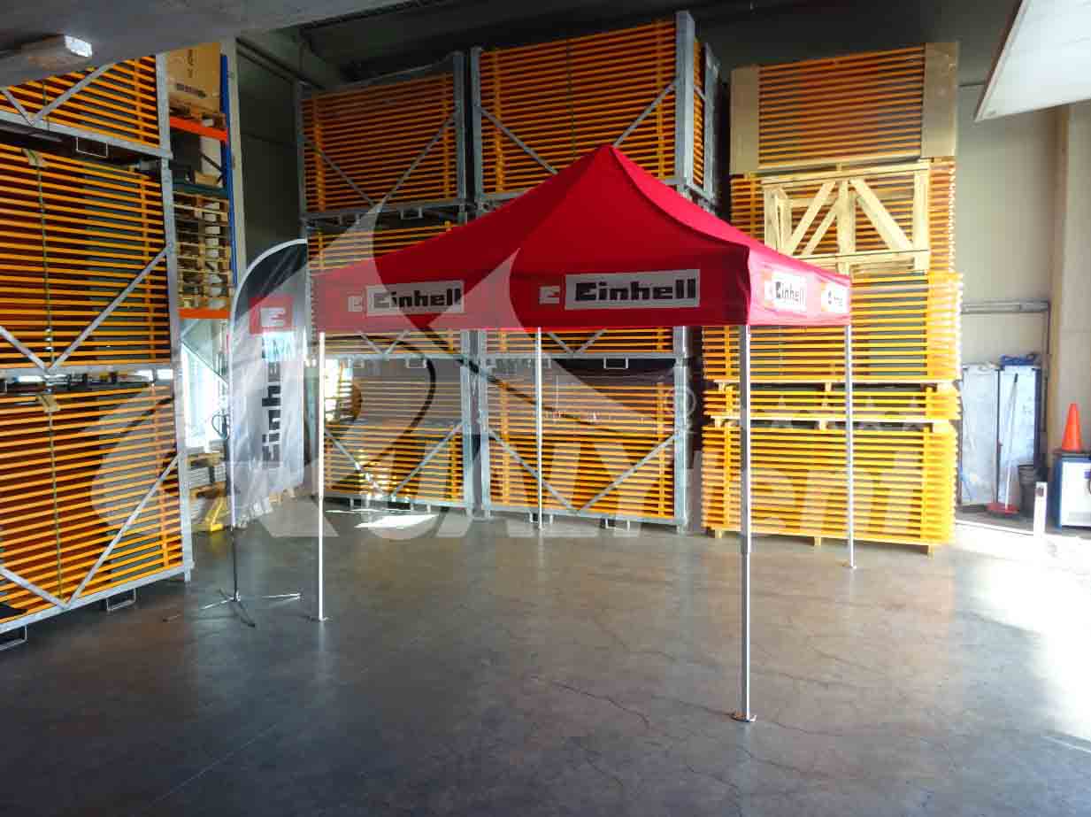 Presentamos otro de nuestros trabajos, la carpa plegable de 3x3m Premium estampada para la empresa Einhell. Una carpa con la impresión de su logo en los cuatro faldones del techo, convirtiéndola en la perfecta carpa publicitaria.