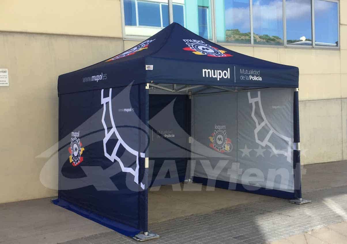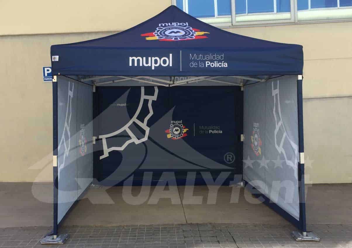 Fabricamos esta carpa plegable de 3x3m para Mupol, Mutualidad de la Policía, personalizandola con sus logos y colores corporativos. Una carpa que destila una imagen espectacular y moderna para los distintos actos y eventos a los que acuden.