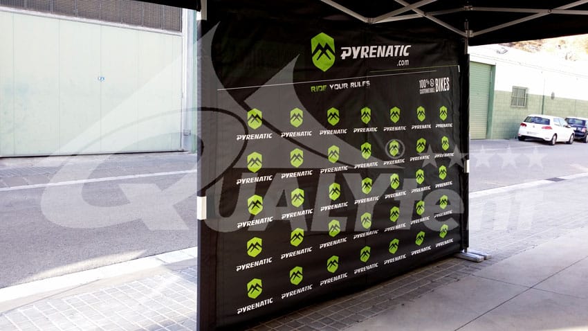 Para la pared, usamos la impresión full print. Nuestro cliente nos pedía un photocall con todos sus logos. Optamos por este sistema por ahorrar costes a Pyrenatic, ya que este sistema permite imprimir en la totalidad de la lona sin límite. Y el resultado es espectacular.