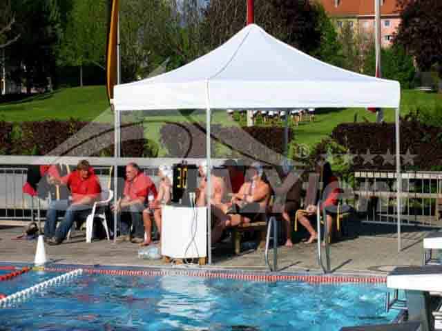 La mejor opción para refrescarse es una buena piscina, contra eso no podemos competir, pero una buena carpa plegable también puede ayudar. En esta ocasión nos encontramos con un espacio protegido en esta competición de natación ofreciendo un respiro a jueces y nadadores.