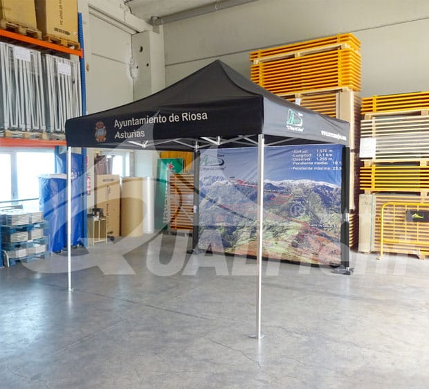 Para el Ayuntamiento de Riosa realizamos esta carpa plegable Premium de 3x3m. Contaba con dos tipos de rotulaciones, la termo impresión por calor, y la digital full print.