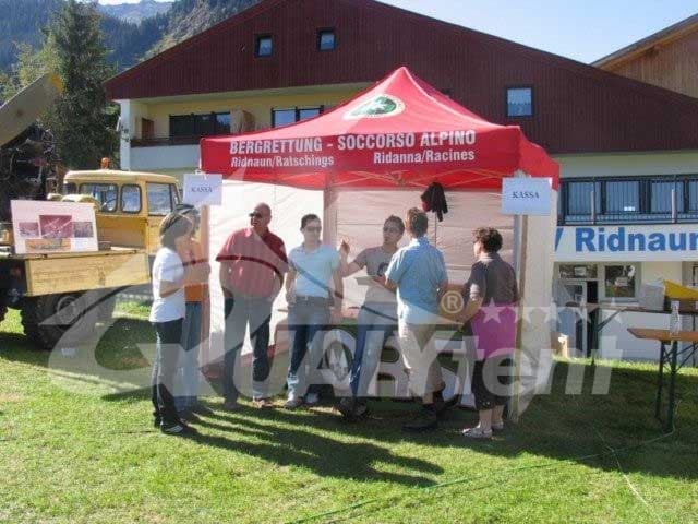 Entregamos esta carpa plegable para los equipos de rescates de montaña en la región de Ridanna-Racines, en los Alpes. Esta es la carpa informativa de 3x3m personalizada con sus logos, y su nombre en italiano y alemán. En color rojo, para ser perfectamente visible en sus intervenciones.