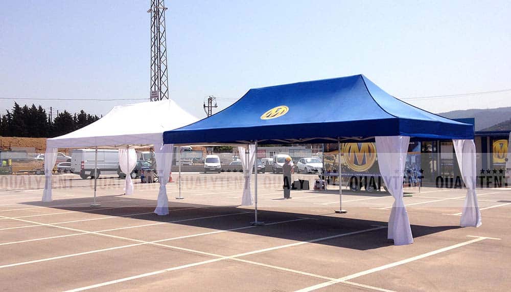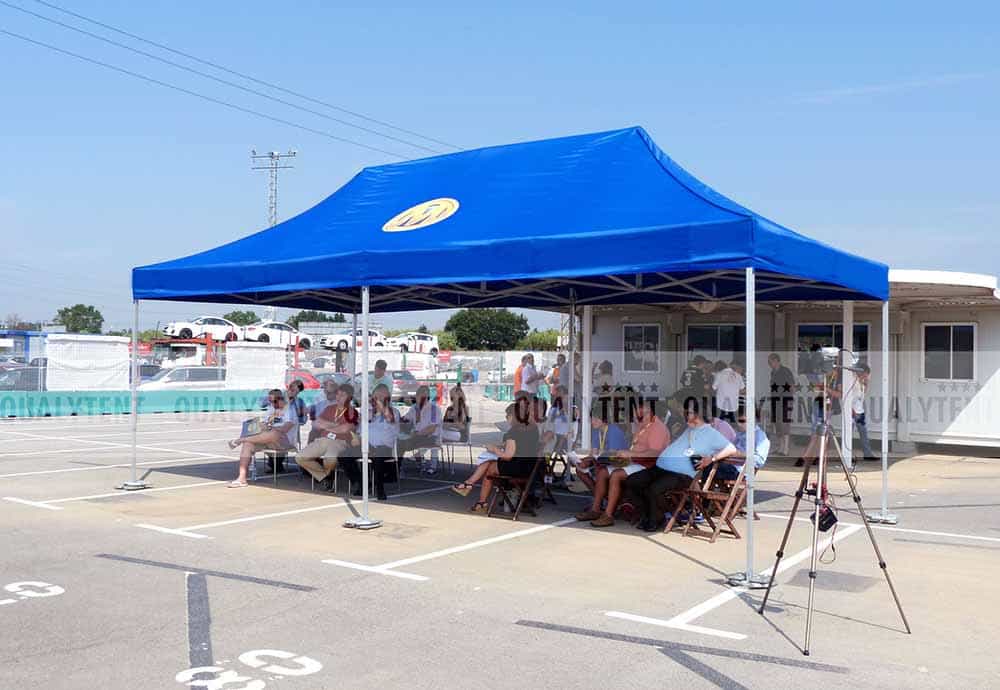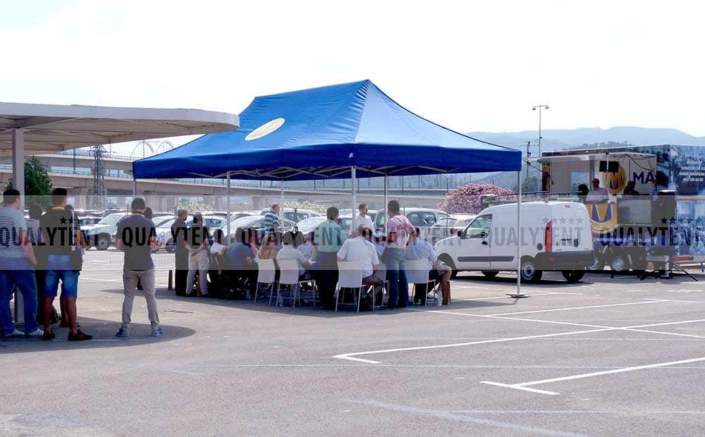 Una carpa plegable, en color azul, y con el logo de la empresa en el techo, para hacer visible el stand a distancia. La personalización en nuestras lonas es una especialización, conseguida por nuestros compañeros durante años, sobre un tejido de alta gama. El Bestex 500D, con un gramaje de 230gr, permite aplicar 140 grados de calor, sin dañarlo, y con una fusión perfecta del logo.