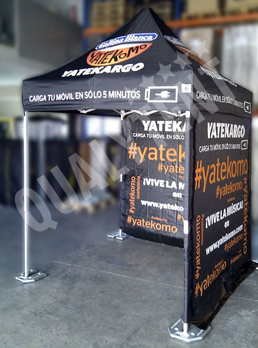 Aquí presentamos un modelo realizado para Yatekomo, para los varios festivales de música a los que acude la marca de promoción. Un stand para cargar el móvil y con la impresión digital full print en toda la carpa, techo y paredes. La gran ventaja de este tipo de impresión, es que podemos llenar toda la lona con logos y mensajes, y el precio no varía. Pueden encontrar más información de nuestros sistemas de impresión en este apartado de nuestra web: Impresión de carpas.