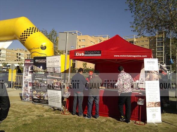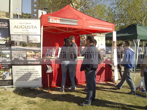 Carpa personalizada, de color rojo y de 3x3m Premium entregada a Motor Club Magazine. Una premisa fundamental para la realización de este stand era que debía ser un espacio que llamara la atención y fuera atractivo a la vista. Planteamos usar su rojo corporativo y, en los cuatro faldones del techo, imprimir su web y su logo. Aquí vemos el resultado en una feria de motor en Barcelona.