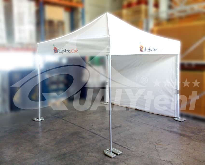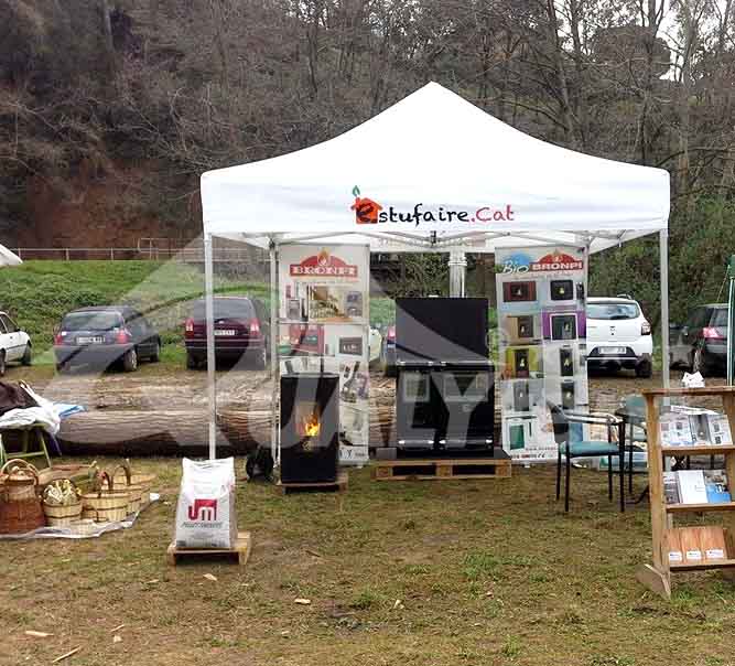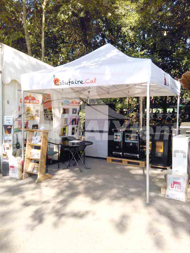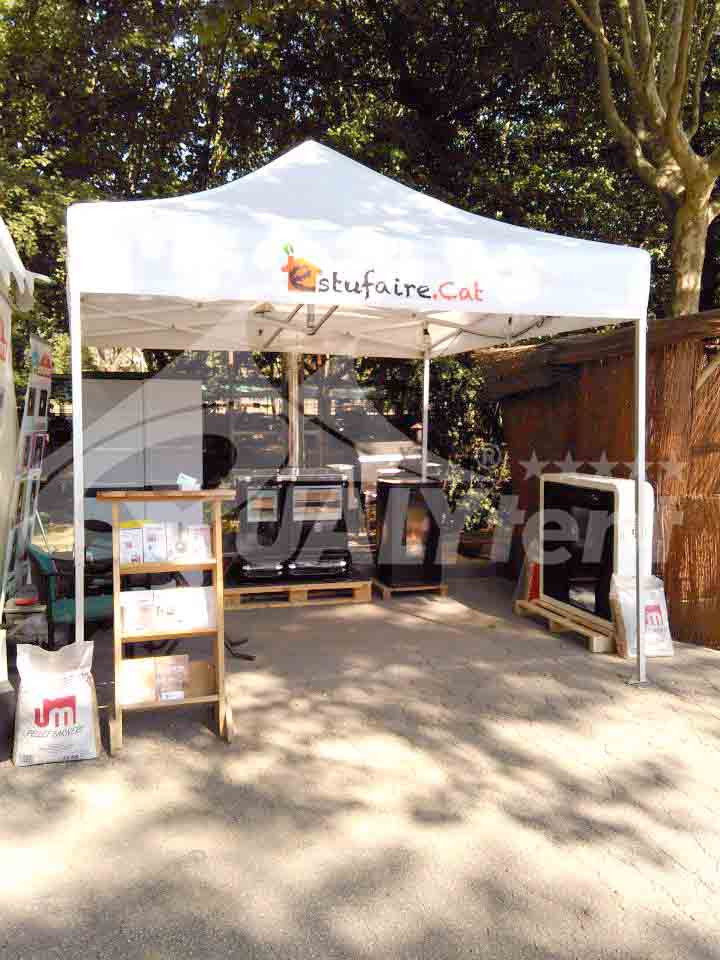 Cuando una empresa tiene un producto de calidad, busca los mejores soportes para acompañarlo. Es es caso de Estufaire, que ha confiado su imagen corporativa en las ferias que acude en nosotros. Con un diseño sencillo y divertido, aplicado en un techo perfectamente tensado, así como una estructura reforzada. Una carpa plegable de 3x3m Premium para años.