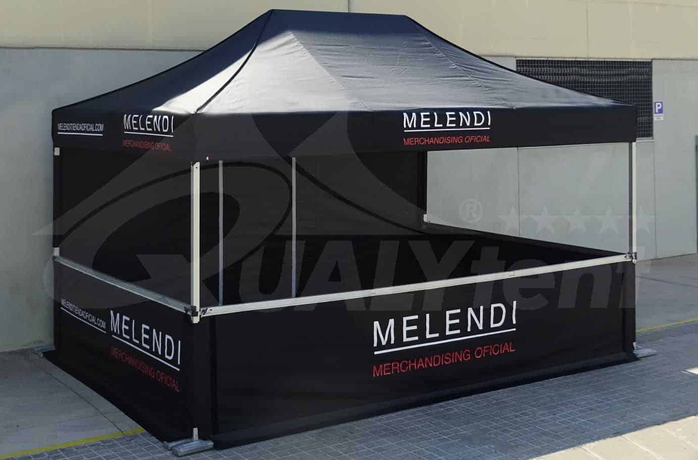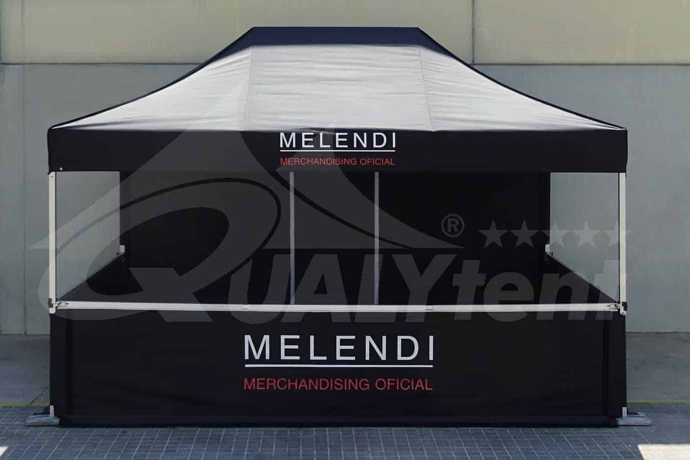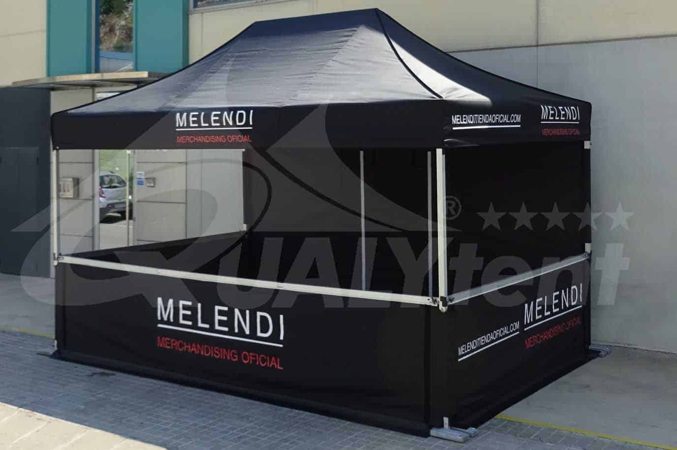 Una las carpas plegables que hemos fabricado y rotulado para el equipo del merchandising oficial de Melendi. Una carpa plegable de 3×4.5m de la serie Premium de Qualytent, perfectamente equipada para la atención al público en los conciertos del artista.
