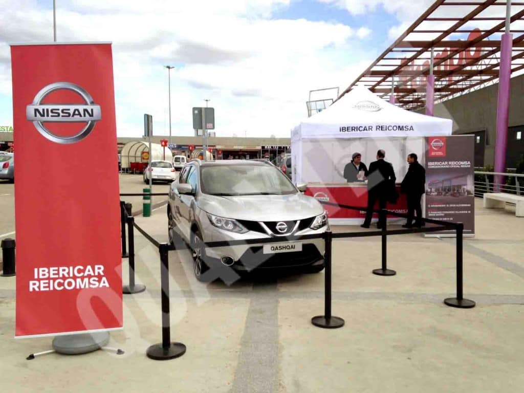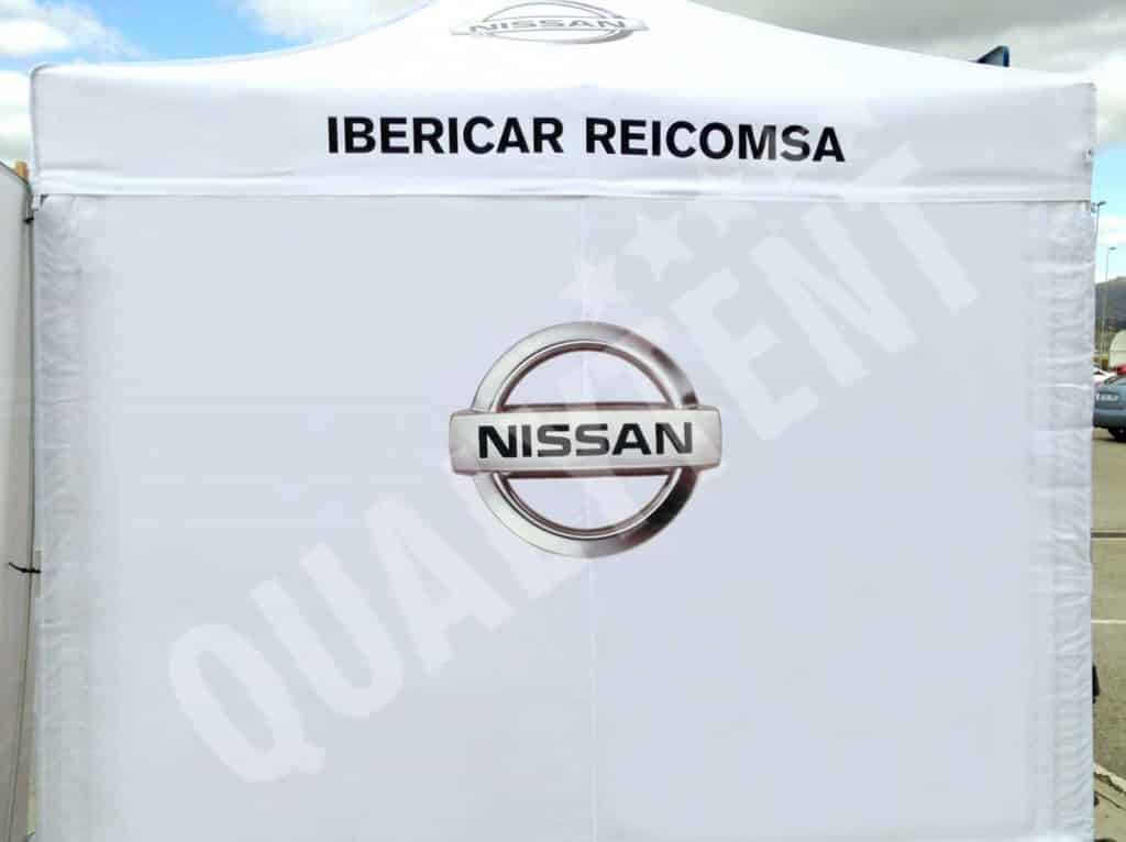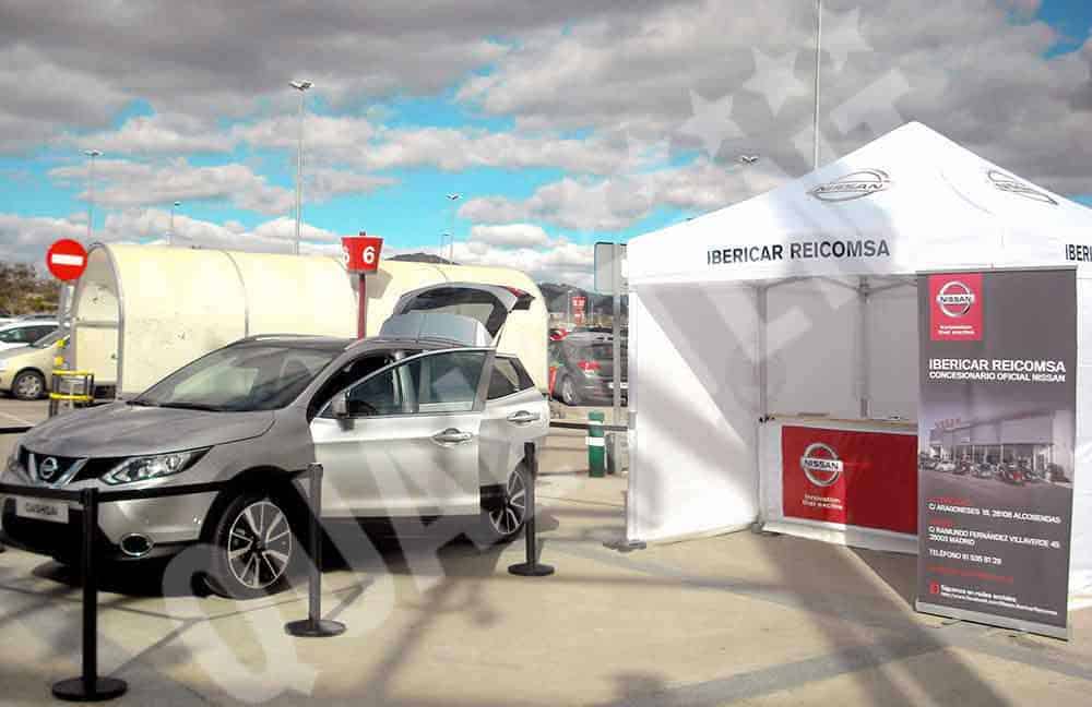 Para Nissan España les hicimos entrega de esta magnífica carpa plegable de 3x3m S-45 Premium. Constaba de un mostrador profesional para la atención al público y con la personalización de sus logotipos en techo y paredes.