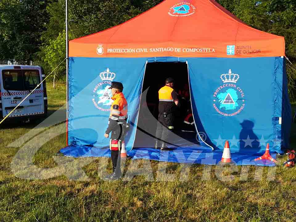 Nuestra carpa plegable Rescue de 5x5m. Y una de las muchas protecciones civiles que han confiado en nuestras tiendas plegables es la de Santiago de Compostela. Esta es la carpa que, a priori debía ser un complemento más para los voluntarios, en acciones o eventos que realizan durante el año. Pero que, en los tiempos que vivimos, ha sido una herramienta muy valiosa para atender a la ciudadanía en la lucha contra el Covid.