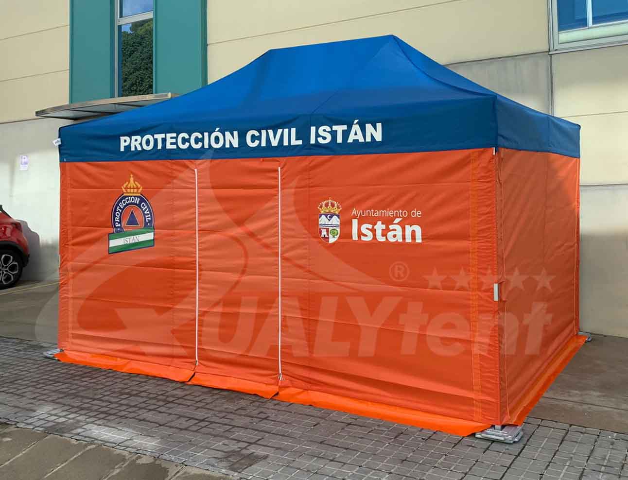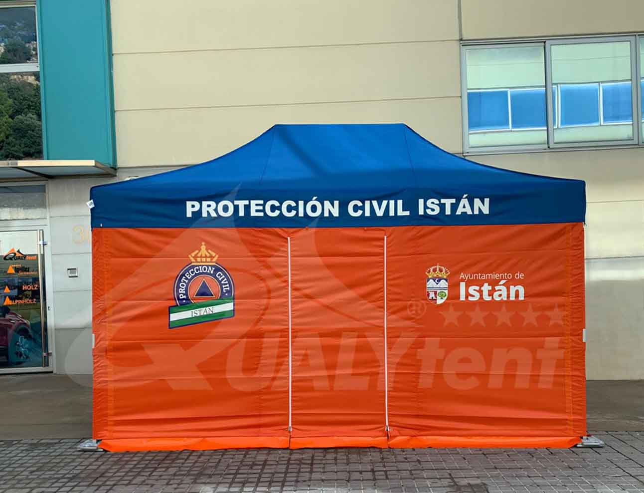 Además cuenta con la rotulación de los logos del ayuntamiento y de la mismas protección civil, para una perfecta identificación de la carpa plegable en todo momento. Los logos se aplican a 140 grados sobre las lonas, para conseguir un fundido perfecto en el tejido, evitando así deterioro en los logotipos.
