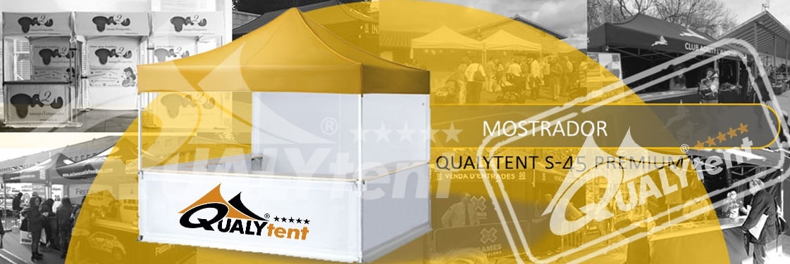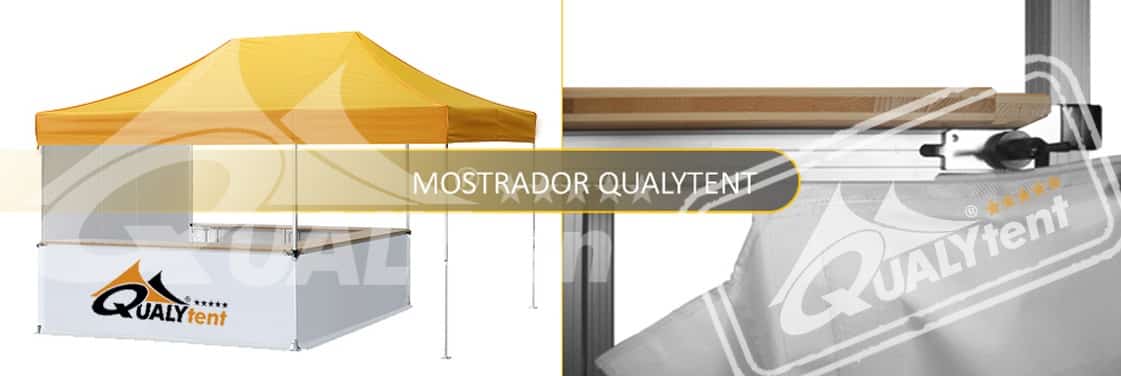 Los mostradores Qualytent se integran, de manera natural, en la estructura de las carpas plegables QT S-45 Premium. Permitiendo su colocación en cualquier de sus laterales, de una forma total o parcial.