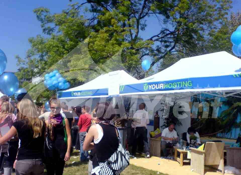 Nuestra personalización busca dar visibilidad a su negocio, y en esta ocasión lo consigue con un mensaje directo y claro. La rotulación de estas carpas plegables de 4x6m Premium QT S-45 en los faldones, identifica perfectamente a la empresa Yourhosting, en esta feria.