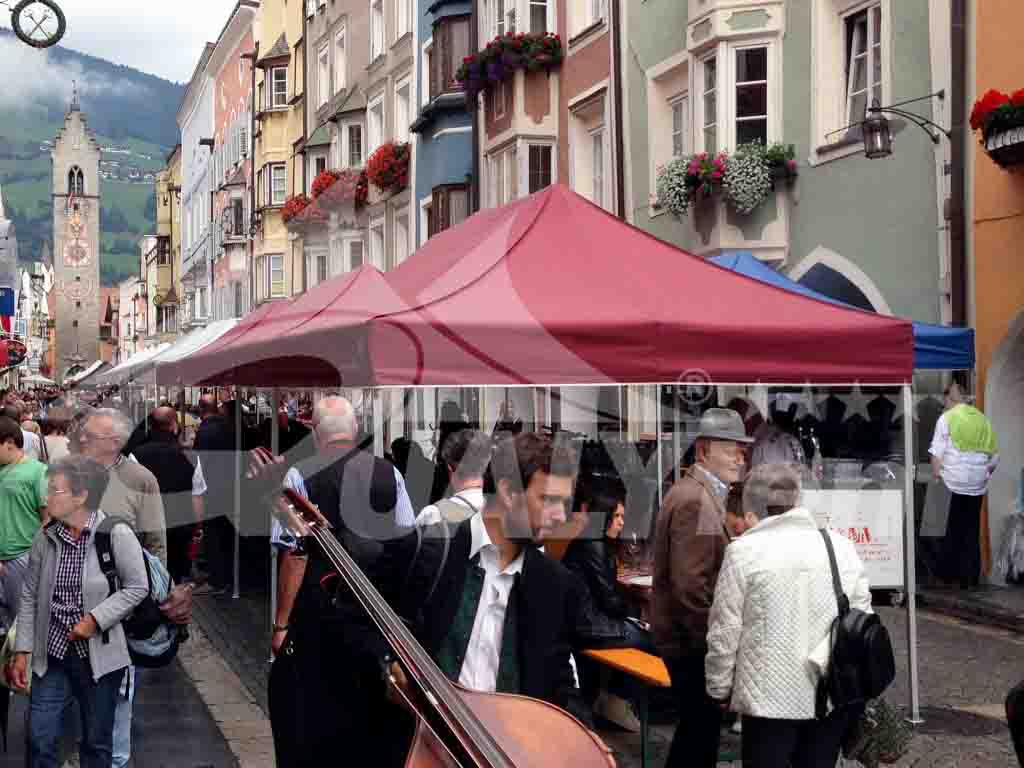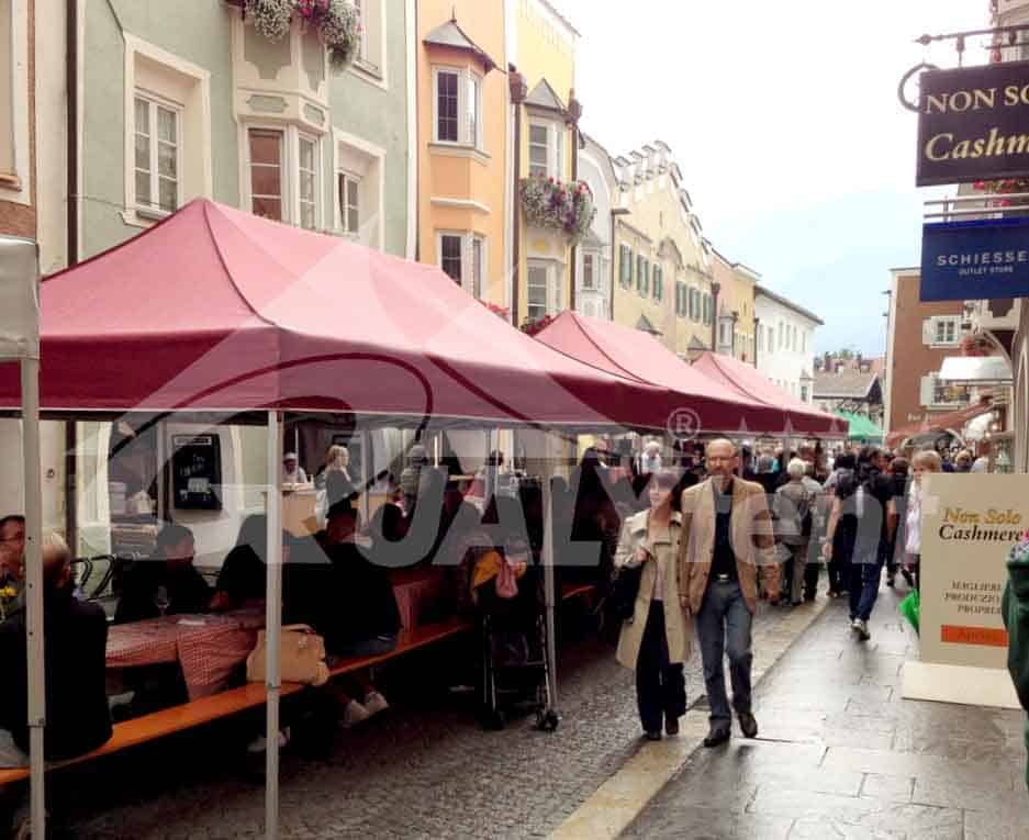 Estas son unas elegantes carpas de color burdeos en una fiesta popular. La perfecta tensión de las lonas es una de nuestras señas de identidad. Cosidas a mano para que encajen perfectamente en cada estructura y ofrezcan una imagen impecable. Además ofrecemos trece colores de serie en nuestro catálogo.