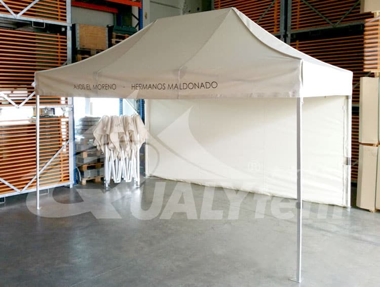 Una de nuestras carpas plegables Premium, en este caso destinada al sector de la distribución de alimentos. Personalizada con el nombre de nuestro cliente, en el faldón, para una rápida identificación de su marca. Las dos carpas escogidas fueron la 4.5x3m QT S-45, una carpa robusta y fuerte para el uso continuado, ya que se monta seis días a la semana. Por descontado, y gracias a nuestra exclusiva lona BESTEX 500D, nuestros techos y paredes son impermeables 100%.