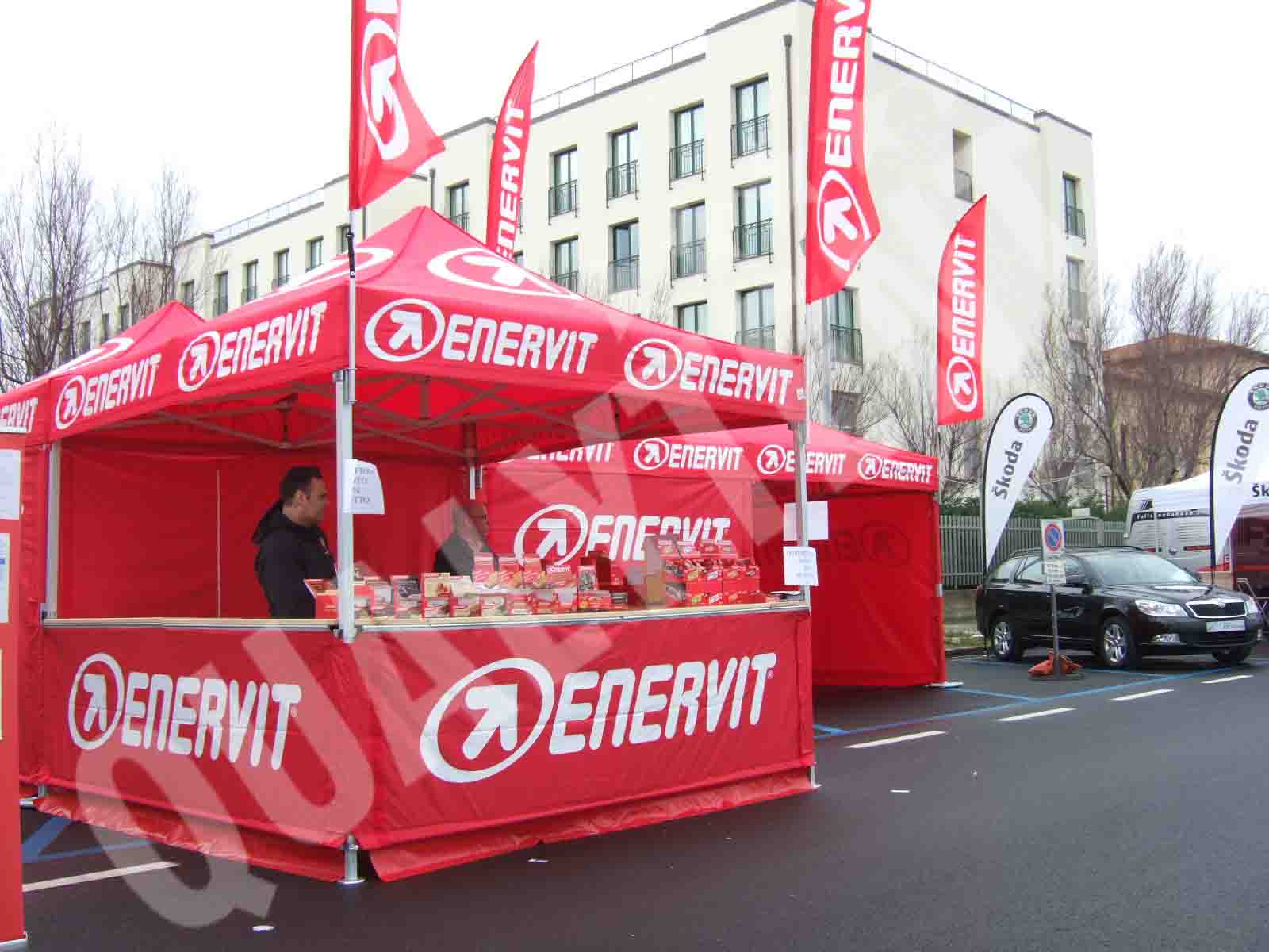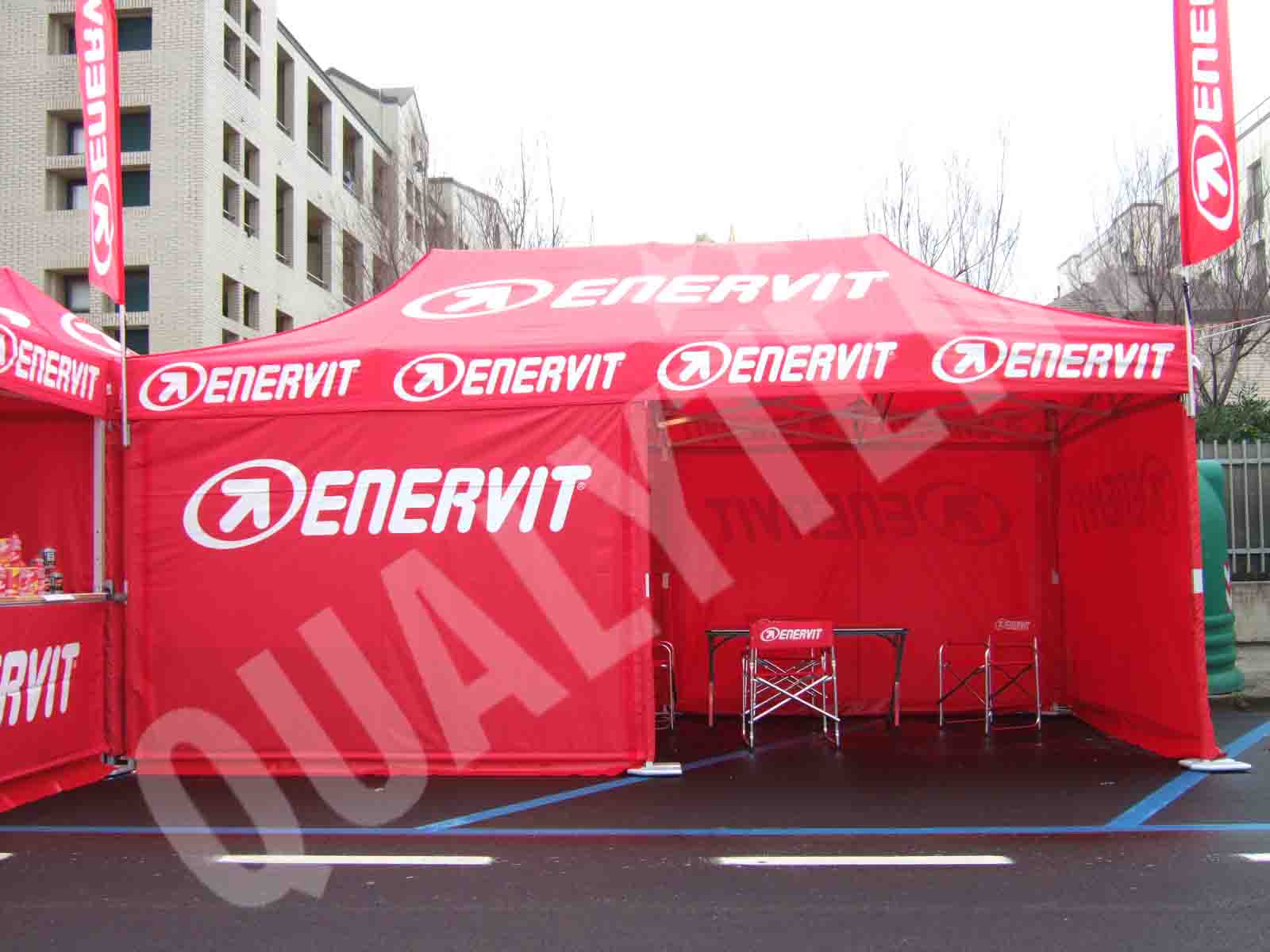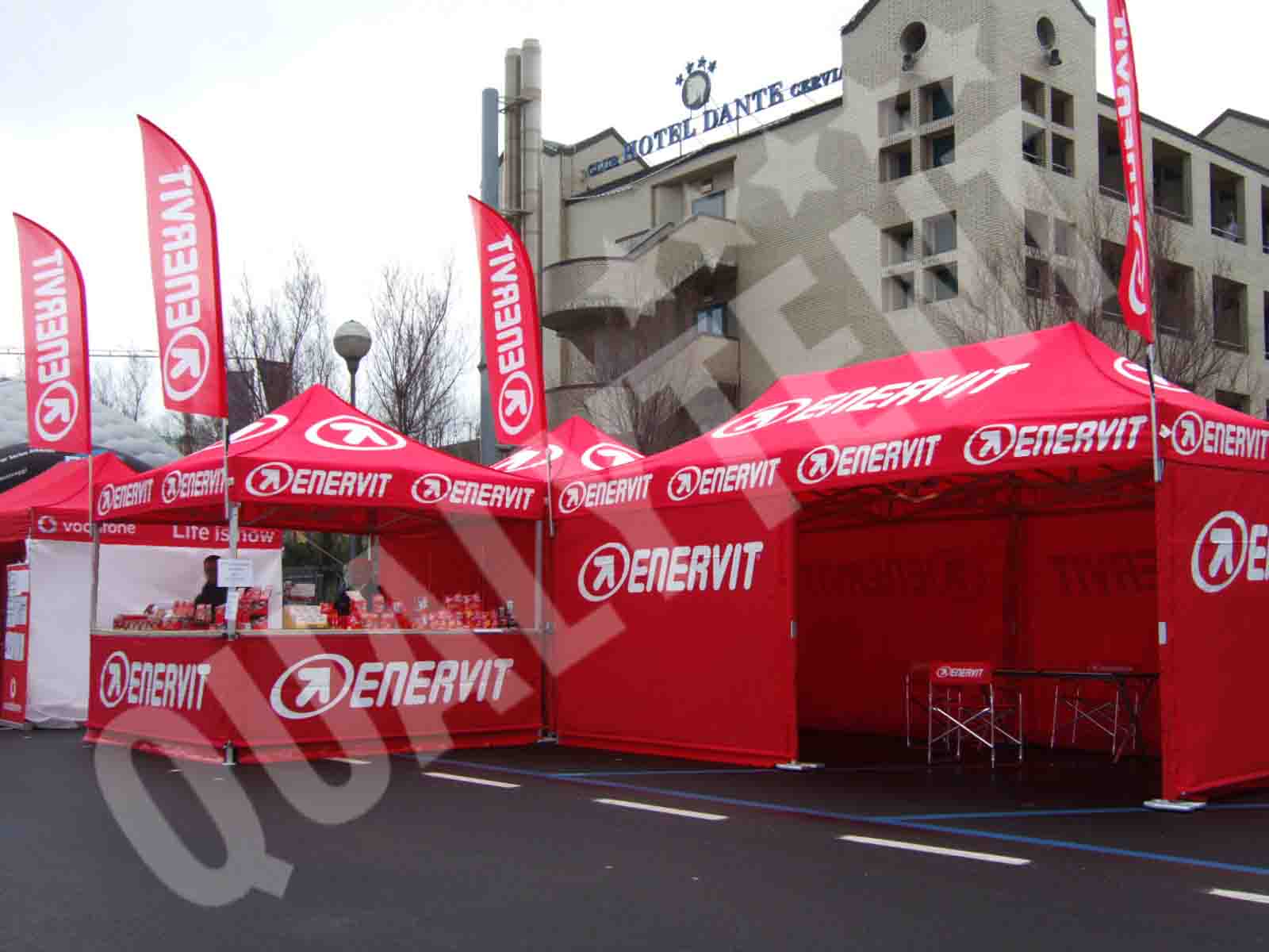 Este es un montaje para la empresa de bebidas energéticas Enervit. Con carpas de 3x3m y carpas de 6x3m en color rojo, con banderas y mostradores, unidas mediante un rápido y fácil montaje modular. Esta unión aumenta el espacio hasta su conveniencia y, con nuestras paredes de cierre, tenemos la posibilidad de dividir el espacio cuando se precise.