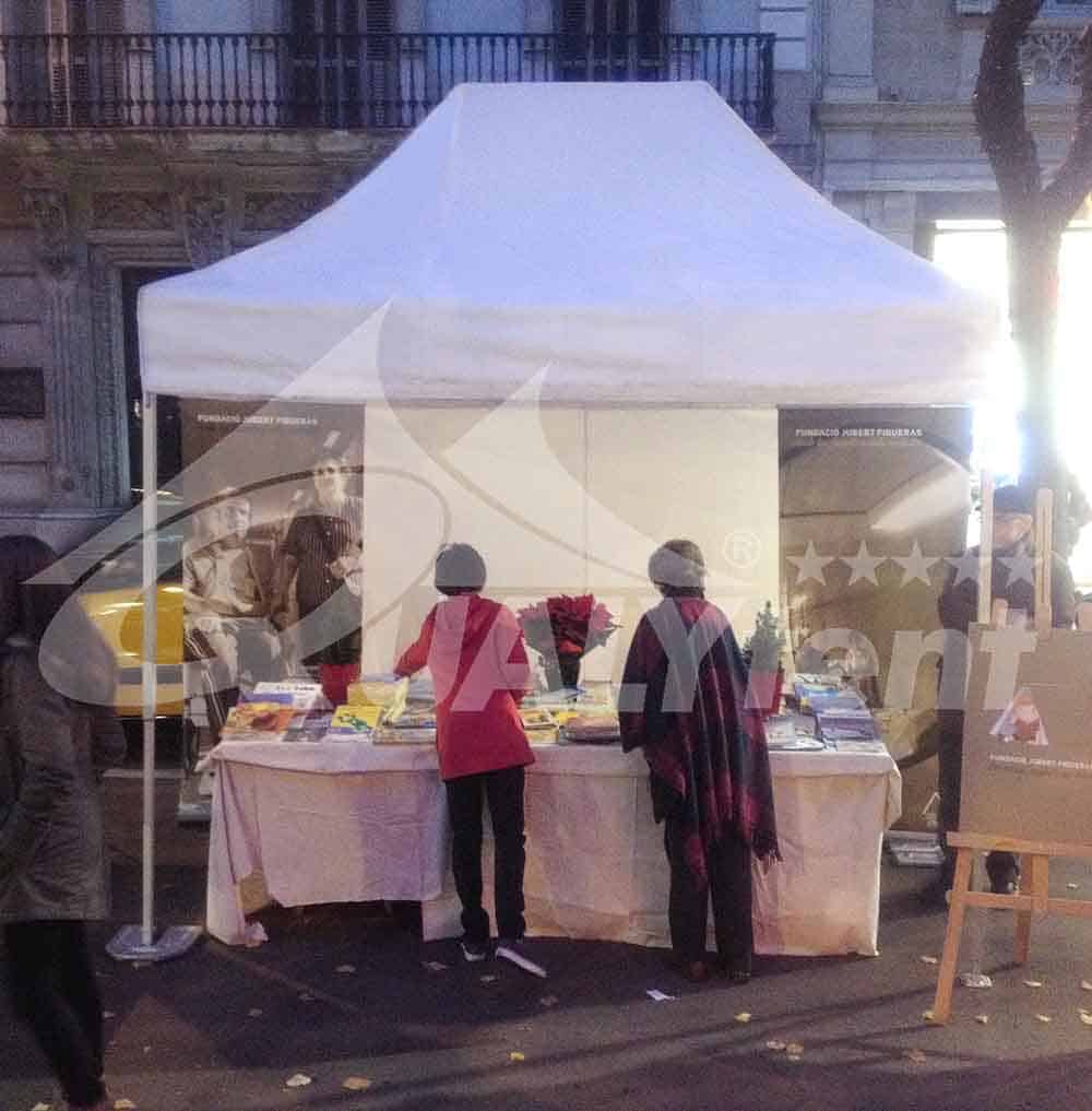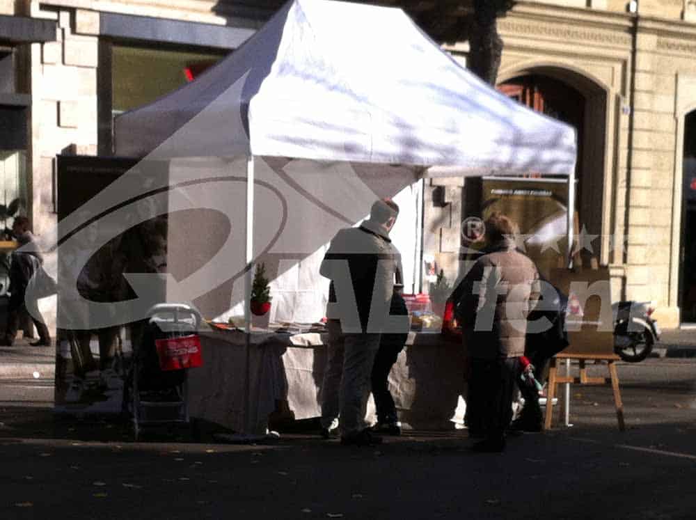 Una de nuestras carpas plegables en acción en un feria celebrada en Barcelona. En concreto presentamos una carpa de 2x3m Premium, un espacio perfecto para ferias urbanas, donde la limitación de espacio suele condicionar un stand. Con esos dos metros de largo, permite montar en calles estrechas sin ningún problema.