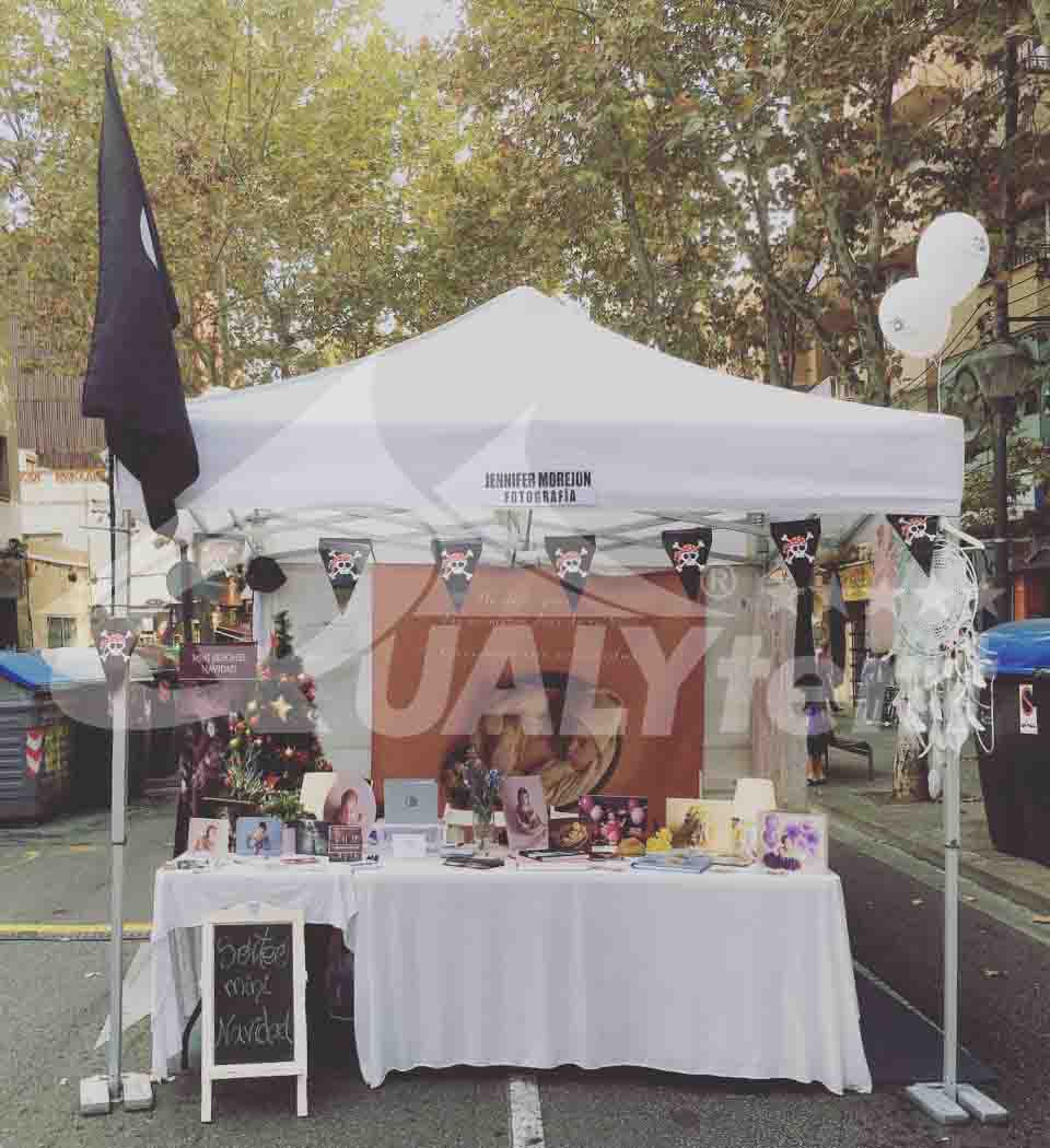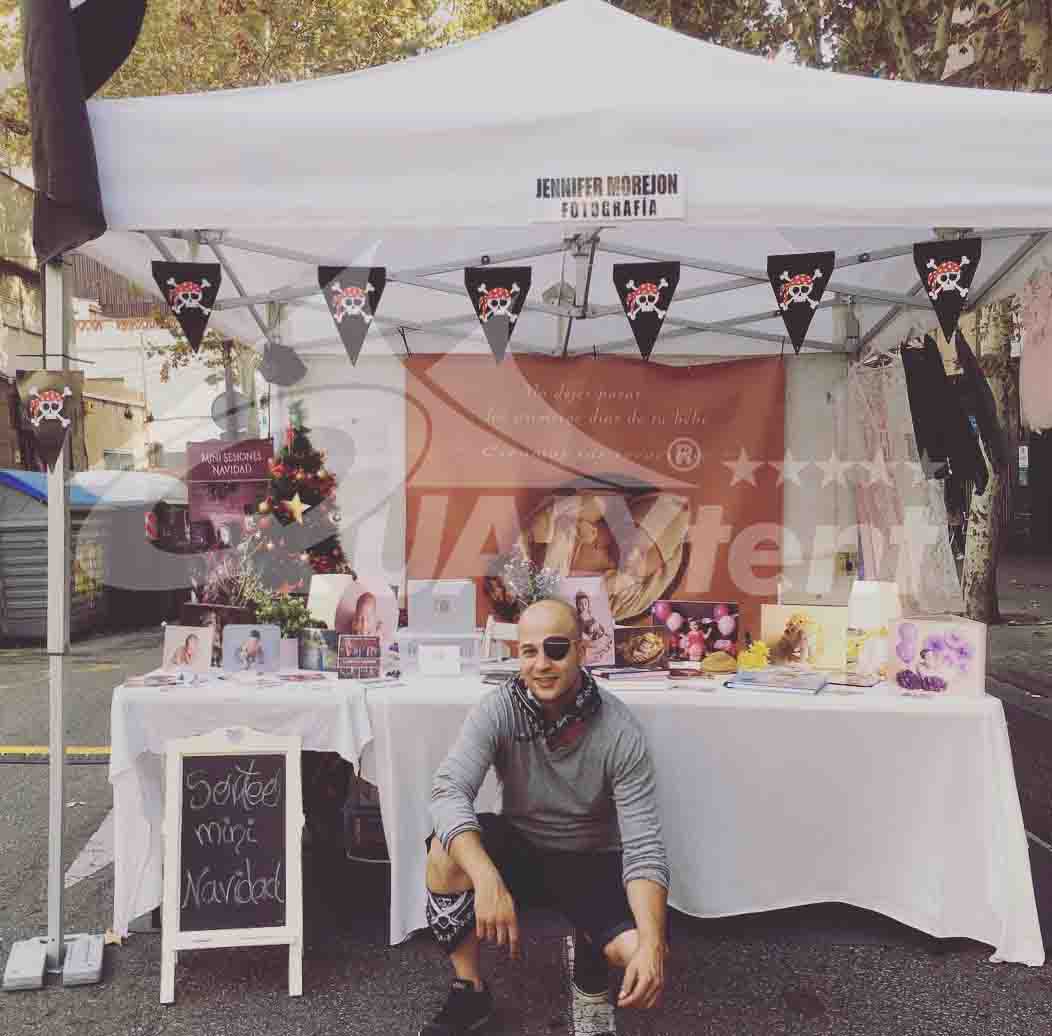 Estas son nuestras carpas plegables, no descansan ni en fin de semana. En este caso, convertidas en un perfecto stand para una feria de comercios en la calle, perfectamente tensada para ofrecer su mejor imagen.