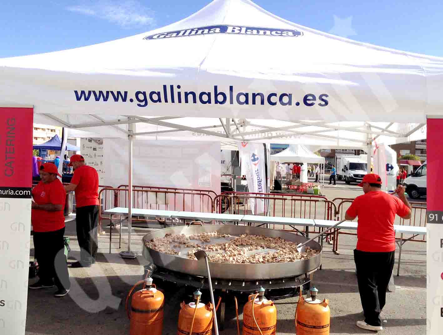 Estas son las carpas plegables que hemos realizado para la empresa de alimentación Gallina Blanca. Dos carpas personalizadas de 4x4m QT S-45 Premium, en color blanco, y con la rotulación de su logo y dirección web en los techos. La idea era conseguir una perfecta visualización de la marca en cada evento al que acuden.