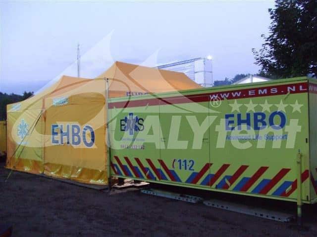 Los cuerpos de prevención y de emergencias confían en nuestras carpas plegables desde nuestros inicios. Siempre han valorado la robustez de las estructuras, sus lonas 100% impermeables e ignífugas de clase T1, así como los accesorios para hacer más fácil su labor. En este caso enseñamos dos carpas plegables de 6x4m Rescue para EHBO, impresas con sus logos para su identificación. En esta intervención, las montaron de forma modular, consiguiendo un espacio diáfano de 12x4m