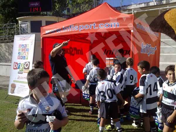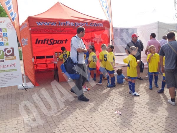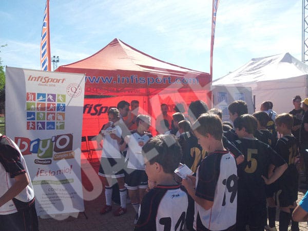 Estas carpas plegables de 3x3m cuentan con la rotulación de los logos y sitio web de Infisport. Realizados mediante nuestro sistema de termo impresión por calor, un método que garantiza, gracias al gramaje de nuestra lona, un resultado perfecto.