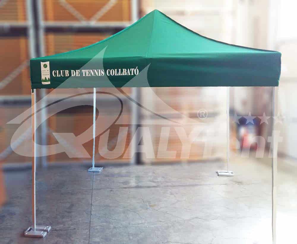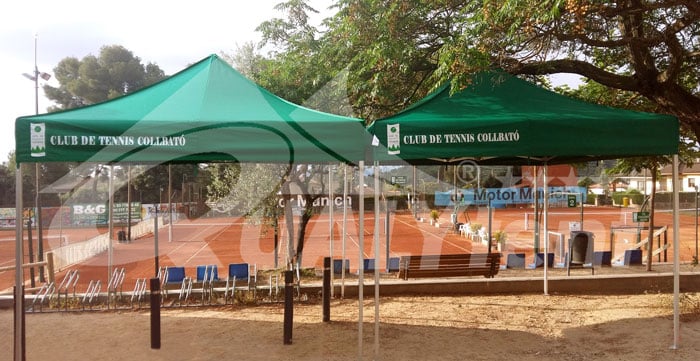 Estas son las carpas plegables de 3×3 verdes que hemos entregado al Club de Tennis Collbató, en Barcelona. De nuestro modelo Premium S-45 y con la personalización en el faldón con el nombre del club. Un perfecto espacio para los eventos y competiciones deportivas que organizan o acuden.