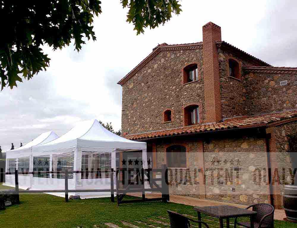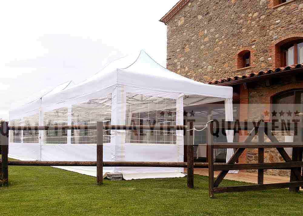 La posibilidad de colocar nuestros elegantes cubrepuntales, o paredes con ventana de pvc, permite un montaje exclusivo y diferente. La perfecta tensión de techos y paredes, nuestra lona BESTEX 500D, se consigue cosiéndolos a mano, encajando perfectamente en las estructuras.