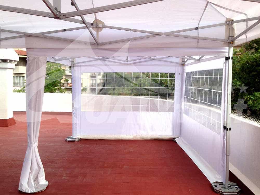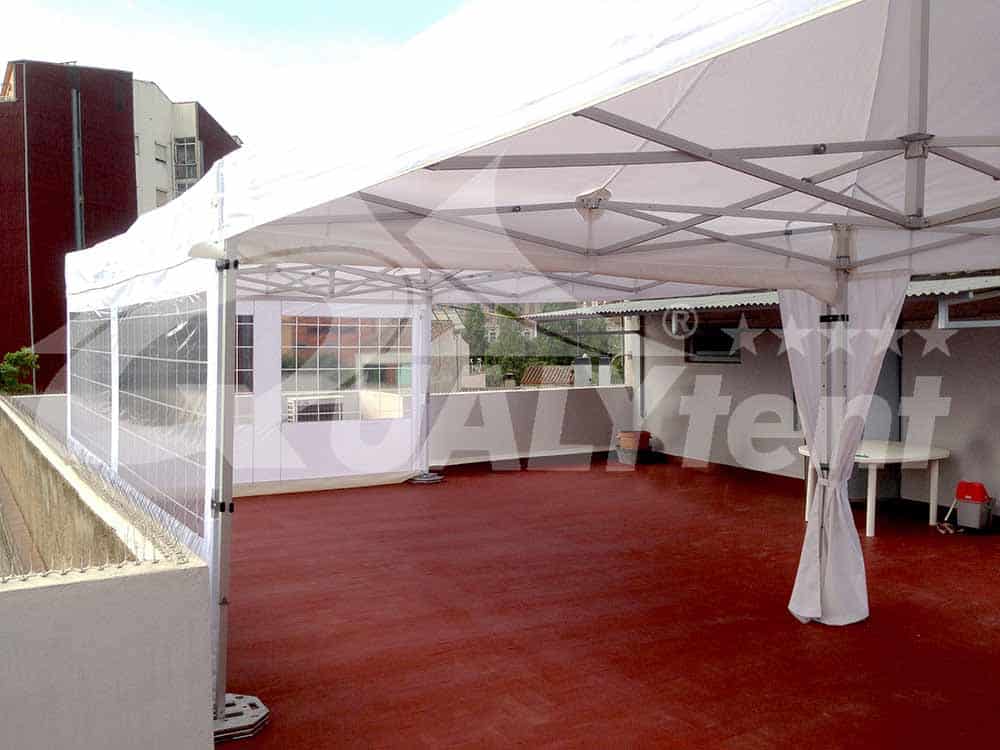 Una carpa de calidad, robusta, profesional… bueno podemos agotar los adjetivos, porque ciertamente, no todas las carpas de montaje rápido pueden estar en terrazas. La exposición al viento es el peor enemigo, y nosotros lo combatimos con perfiles reales de 2mm de grosor en patas y tijeras. Además reforzamos la seguridad con nuestros accesorios, pesos de seguridad o abrazaderas, como se ve en las imágenes.
