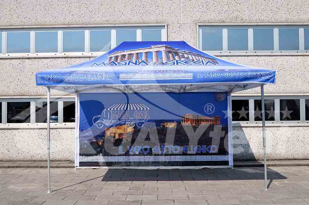 El voladizo es uno de los accesorios más solicitados para los profesionales de los mercados o food trucks. Y aquí nos encontramos con este último sector. Esta empresa de food truck especializada en comida griega, Magna Grecia, adquirió dos carpas plegables de 4.5x3m Premium con visera. Un complemento perfecto para proteger a sus clientes y al producto, al proporcionar 90cms de cobertura adicional.