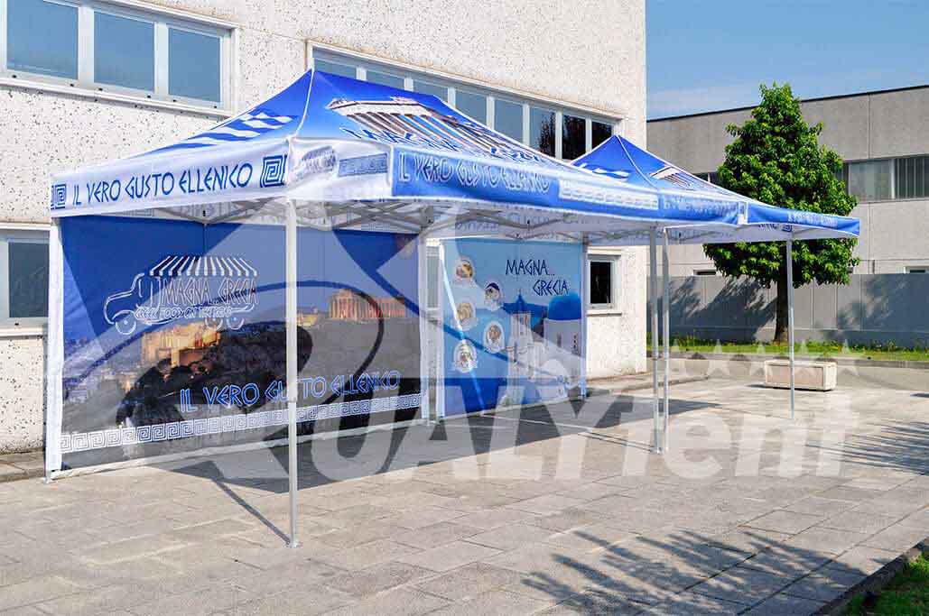Espectacular también es la personalización creada, ya que imprimimos en la totalidad de las lonas. Una impresión digital full print con imágenes griegas y con el nombre de los restauradores. Una carpa que llama la atención, y que atrae a clientes. Una forma de diferenciarse de su competencia.