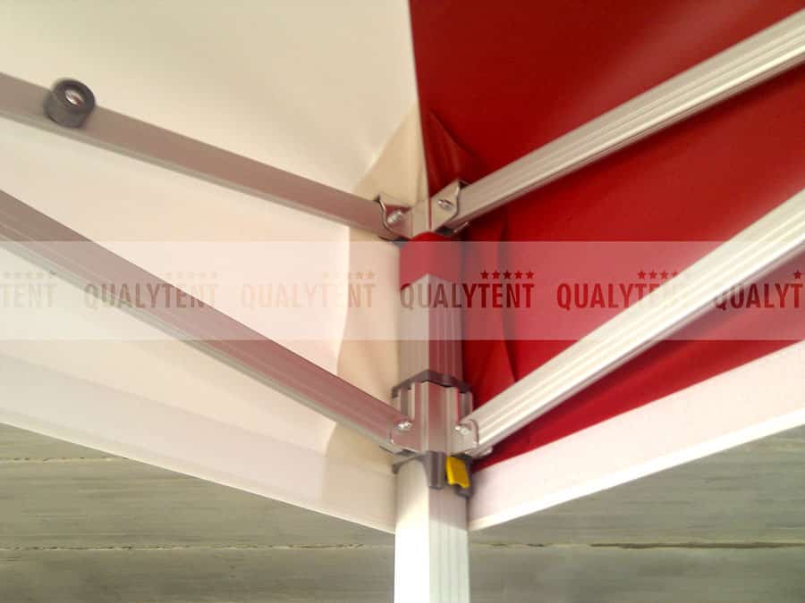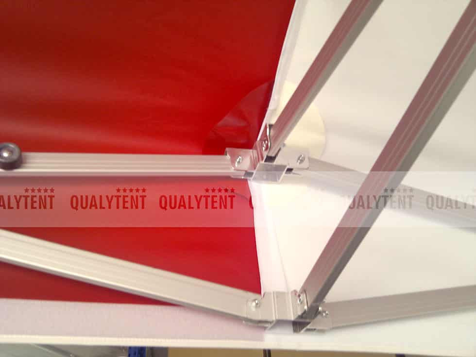 En la imagen superior vemos las uniones de tijeras de las estructuras. Esta zona es donde más sufre una carpa plegable cuando aprieta el viento. Mientras otras carpas, para ahorrar costes, usan piezas de plástico, nosotros usamos aluminio, con el mismo refuerzo que el resto de la carpa. Además, en el pieza superior, con cantos perfilado redondos, para no rascar en el techo. Siempre buscamos la protección de su stand.