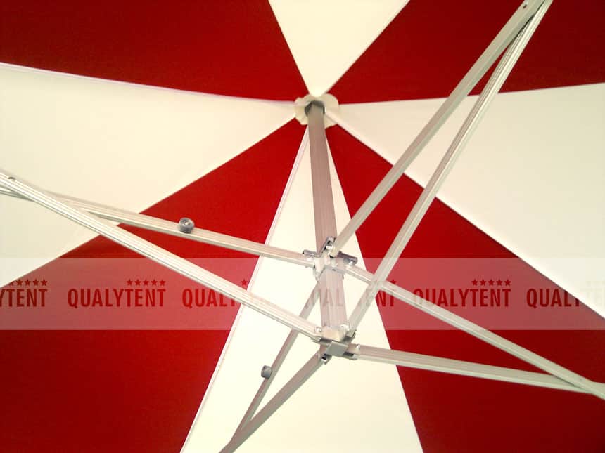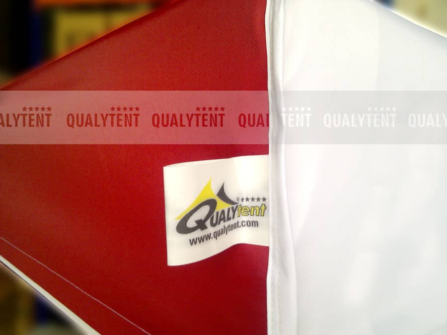 Como fabricantes realizamos cualquier petición que un cliente nos haga llegar, como este techo bicolor. Combinando rojo y blanco, conseguimos esta espectacular, que, cosida a mano, adaptándose a la estructura, consigue una perfecta tensión.