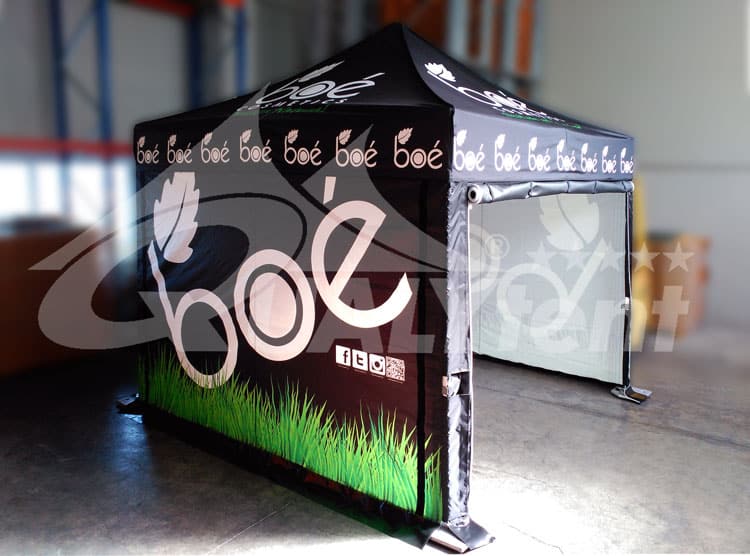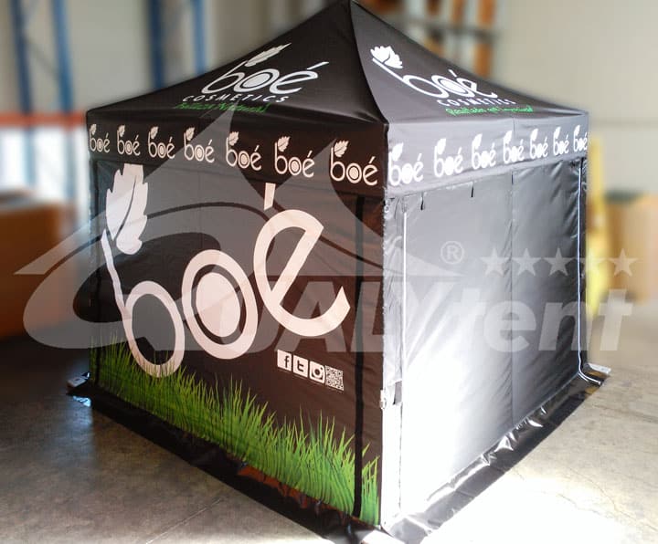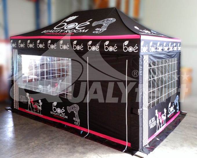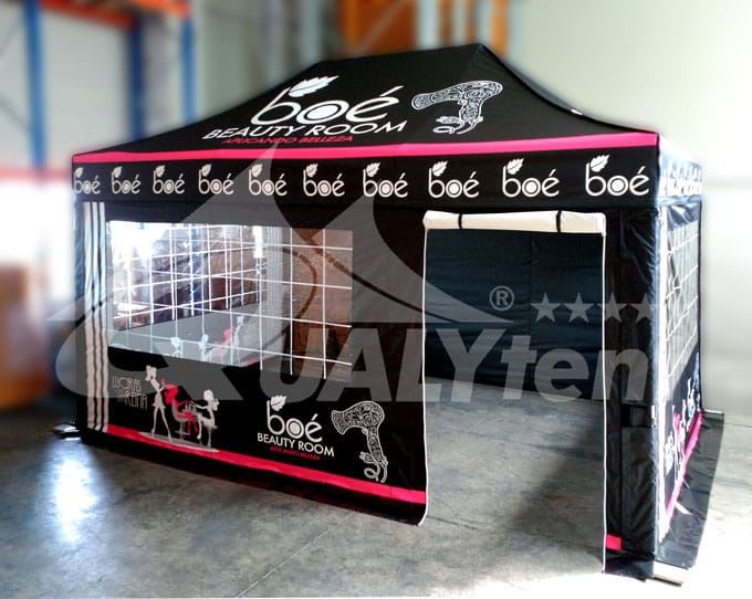 En primer lugar hablamos de la carpa plegable de 3×4.5m Premium para Beauty Room, cuyo aspecto es este. Una carpa customizada full print, tanto en paredes como en techo. Buscando la máxima visibilidad e impacto visual. La fuerza de la impresión digital full print es que disponemos de toda la tela para poner sus logos o mensaje, sin limite. Una vez impresa, se cose ajustando al milímetro con la estructura, para su perfecta tensión.