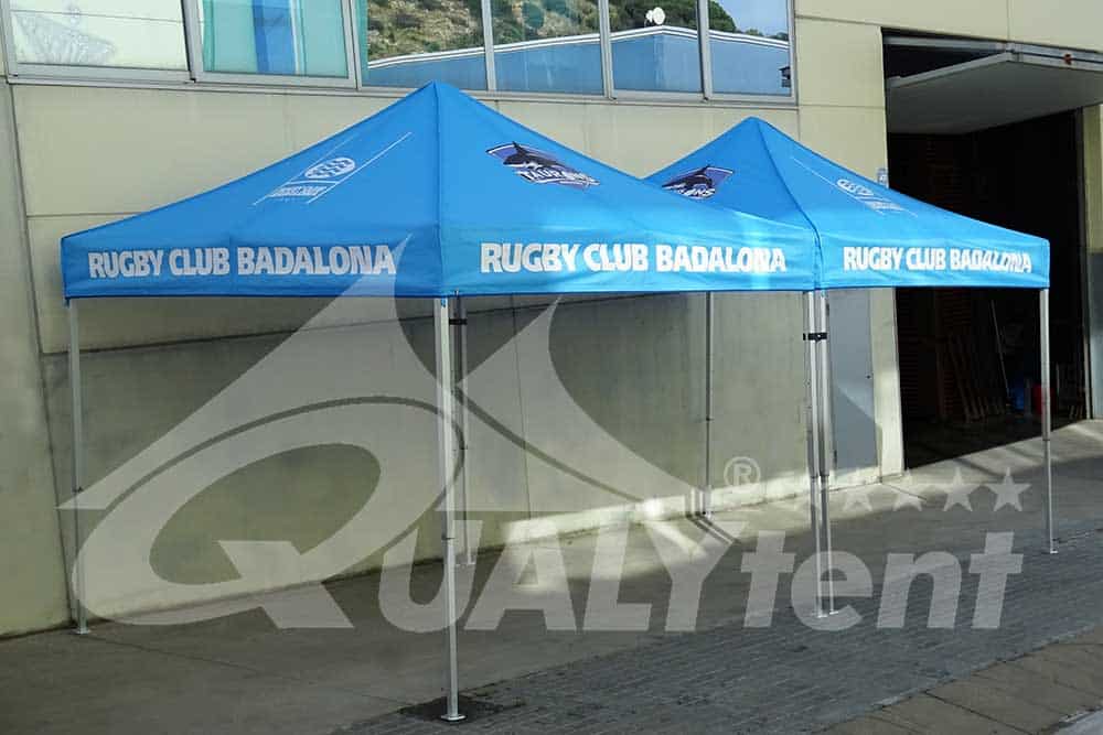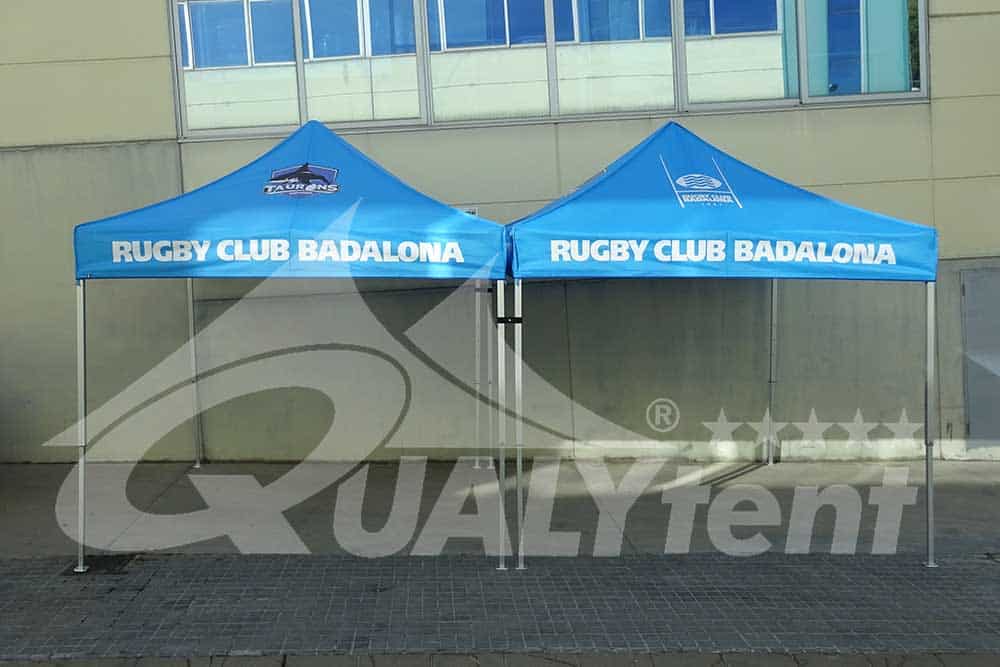 Dos de nuestras carpas plegables de la serie 45 Premium de Qualytent, entregadas al Club de Rugby de Badalona. Unas carpas que cuentan con la personalización de sus logos en el techo para la perfecta identificación de su espacio en cualquier evento.