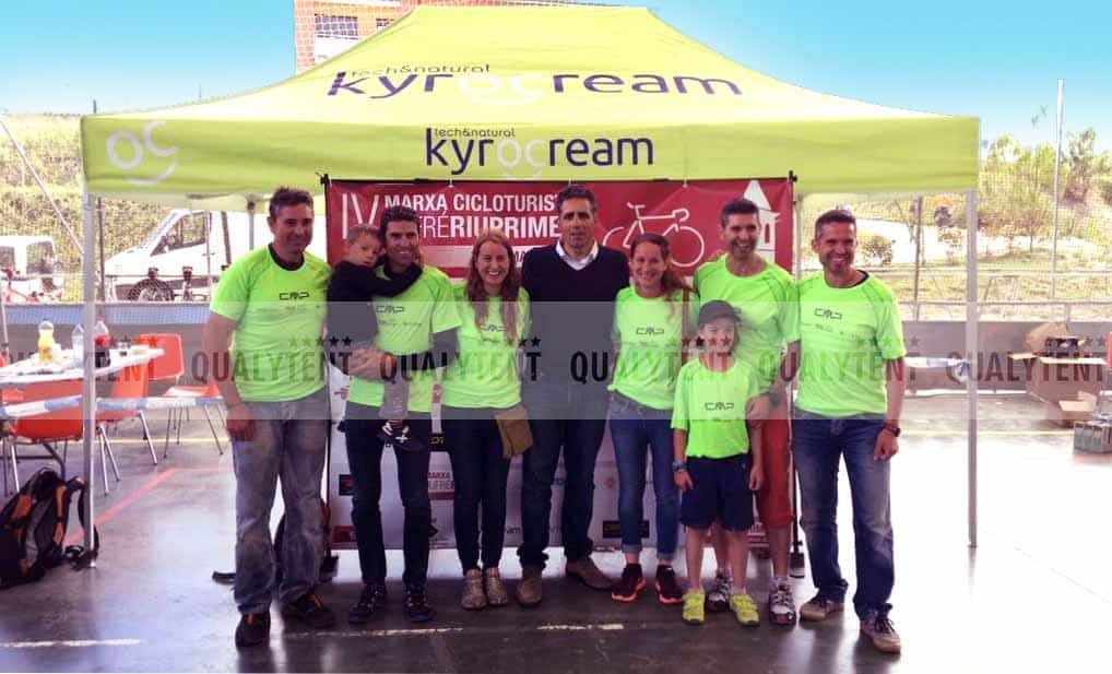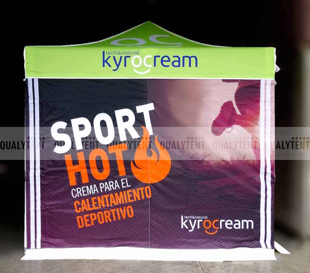 Fabricamos carpas publicitarias para empresas, como la carpa plegable personalizada full print que realizamos para la empresa Kyrocream. Una carpa de 4.5×3m Premium con el techo y las paredes (a doble cara) impresas digitalmente, con un resultado impecable.