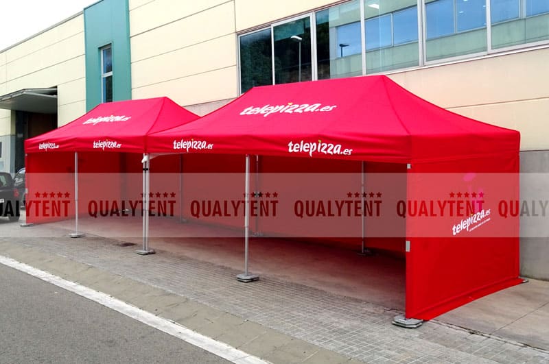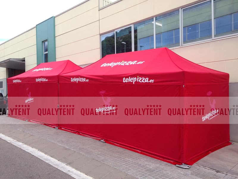 Para la empresa de alimentación Telepizza, hemos realizado varias carpas plegables para sus acciones comerciales. El modelo escogido fue nuestra carpa plegable de 6x3m Premium QT Serie 45, en su color rojo corporativo y personalizada con sus logos.