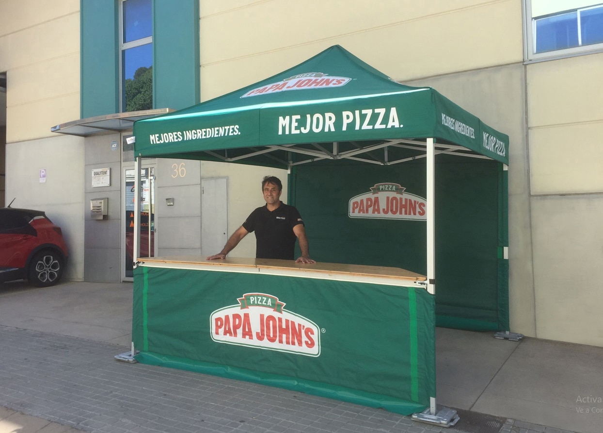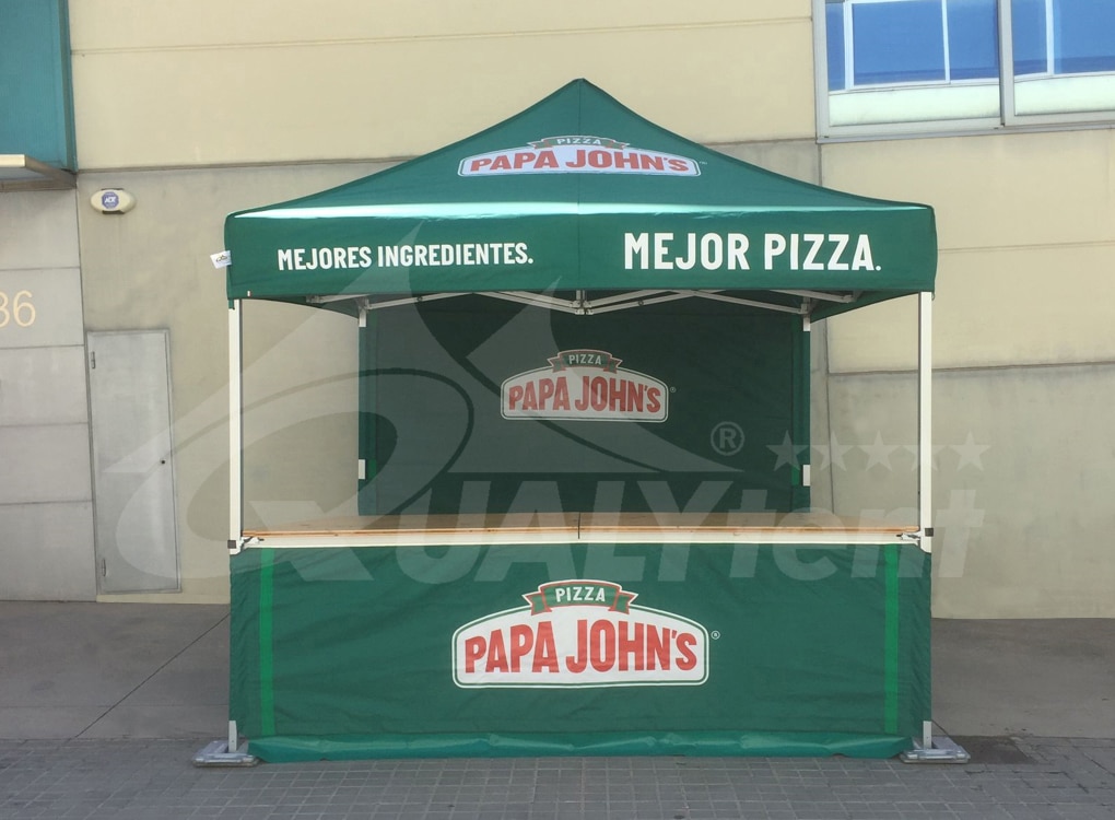 Una espectacular y llamativa carpa para la promoción de la cadena de pizzas Papa John´s. Nuestro modelo Premium, y en la medida de 3x3m, sirve como un perfecto espacio publicitario con los mensajes impresos en techo y paredes.