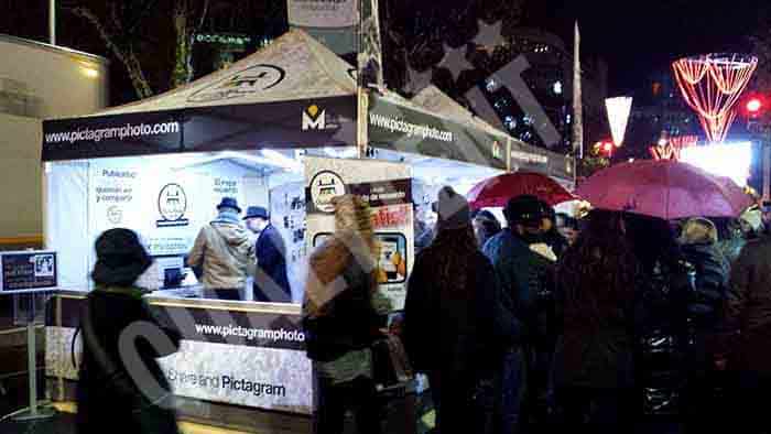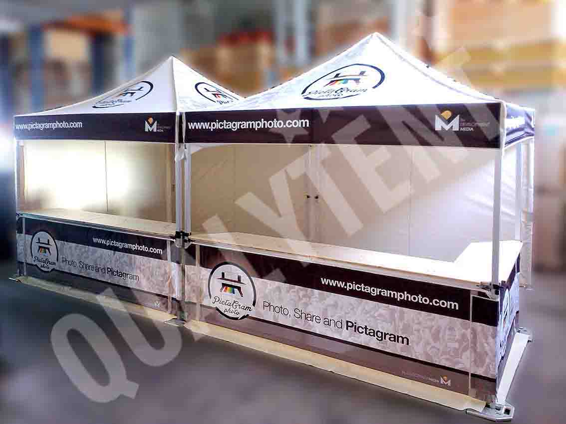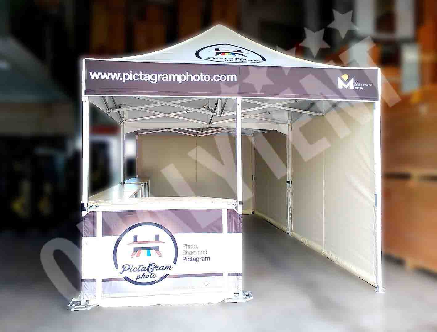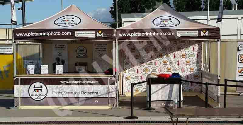 Les presentamos las carpas plegables de 3x3m que Picta Print Photo nos han adquirido. Unas carpas realizadas mediante nuestro sistema de impresión digital full print, con sus logos en techos y paredes. Además, incorporan mostradores de madera que sirven para atender a los clientes, de forma elegante y cómoda, en los diversos eventos en los que participan.